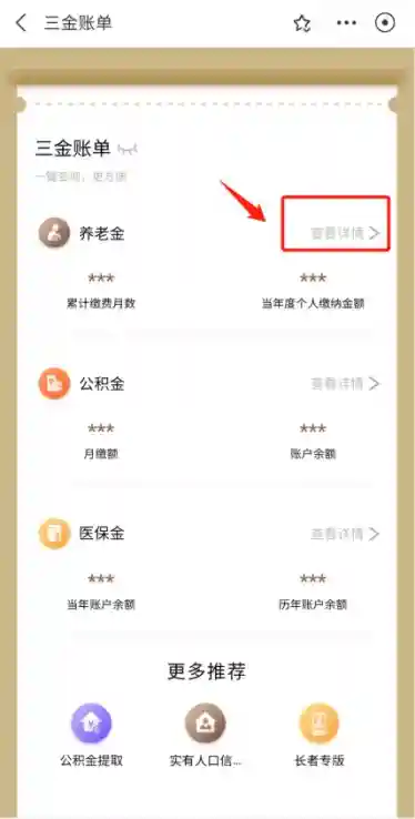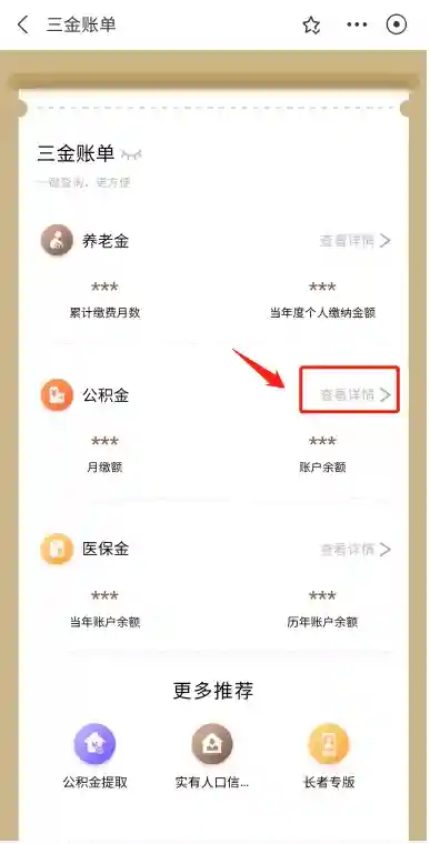 3、“三金账单”页面选择“公积金”,即可一键查看账户信息,确认账户状态及末次汇款月份。
