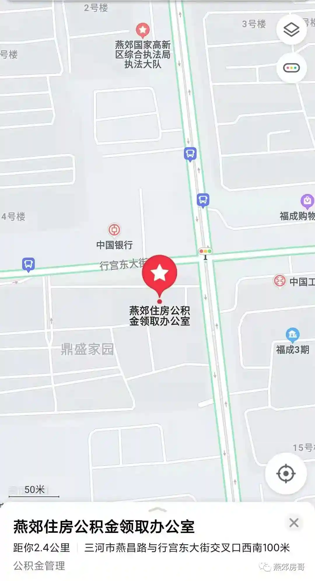 燕郊住房公积金管理中心位于燕郊燕昌路与行宫大街交叉口西侧建设银行二楼。给大家上个定位。