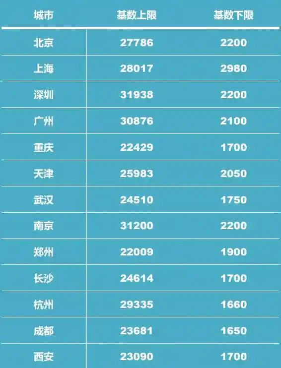 以下为部分省市公布的公积金缴纳基数上限和下线: