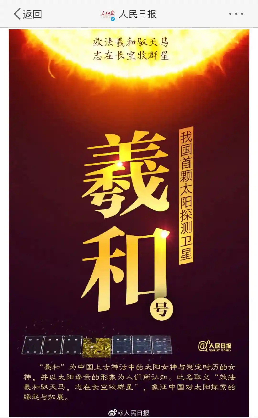 10月14日18时51分,我国在太原卫星发射中心采用长征二号丁运载火箭,成功发射首颗太阳探测科学技术试验卫星“羲和号”,实现了我国太阳探测零的突破,我国太空探测正式步入探日时代。该星将实现国际首次太阳Hα波段光谱成像的空间探测,填补太阳爆发源区高质量观测数据的空白,提高我国在太阳物理领域研究能力,对我国空间科学探测及卫星技术发展具有重要意义。