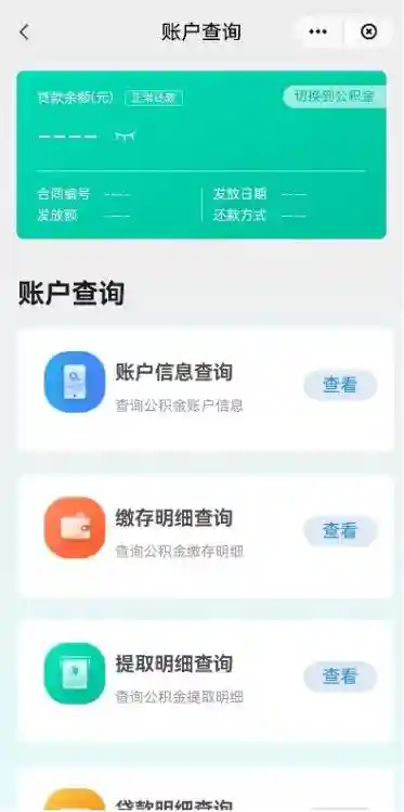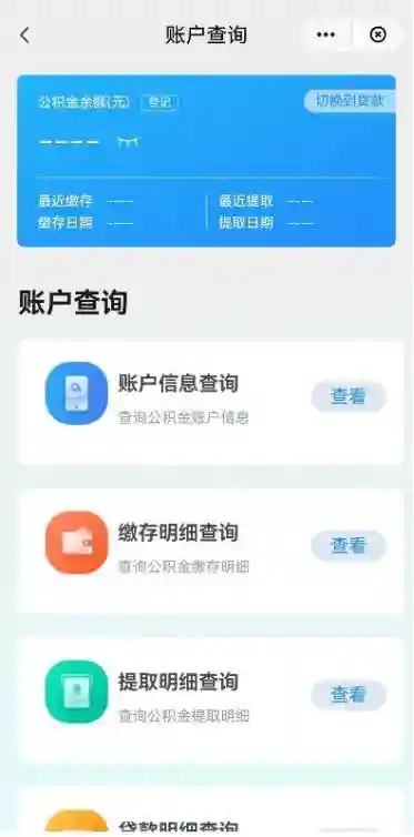切换到公积金/贷款,可以进行账户信息查询、缴存明细查询、提取明细查询、贷款明细查询等。
