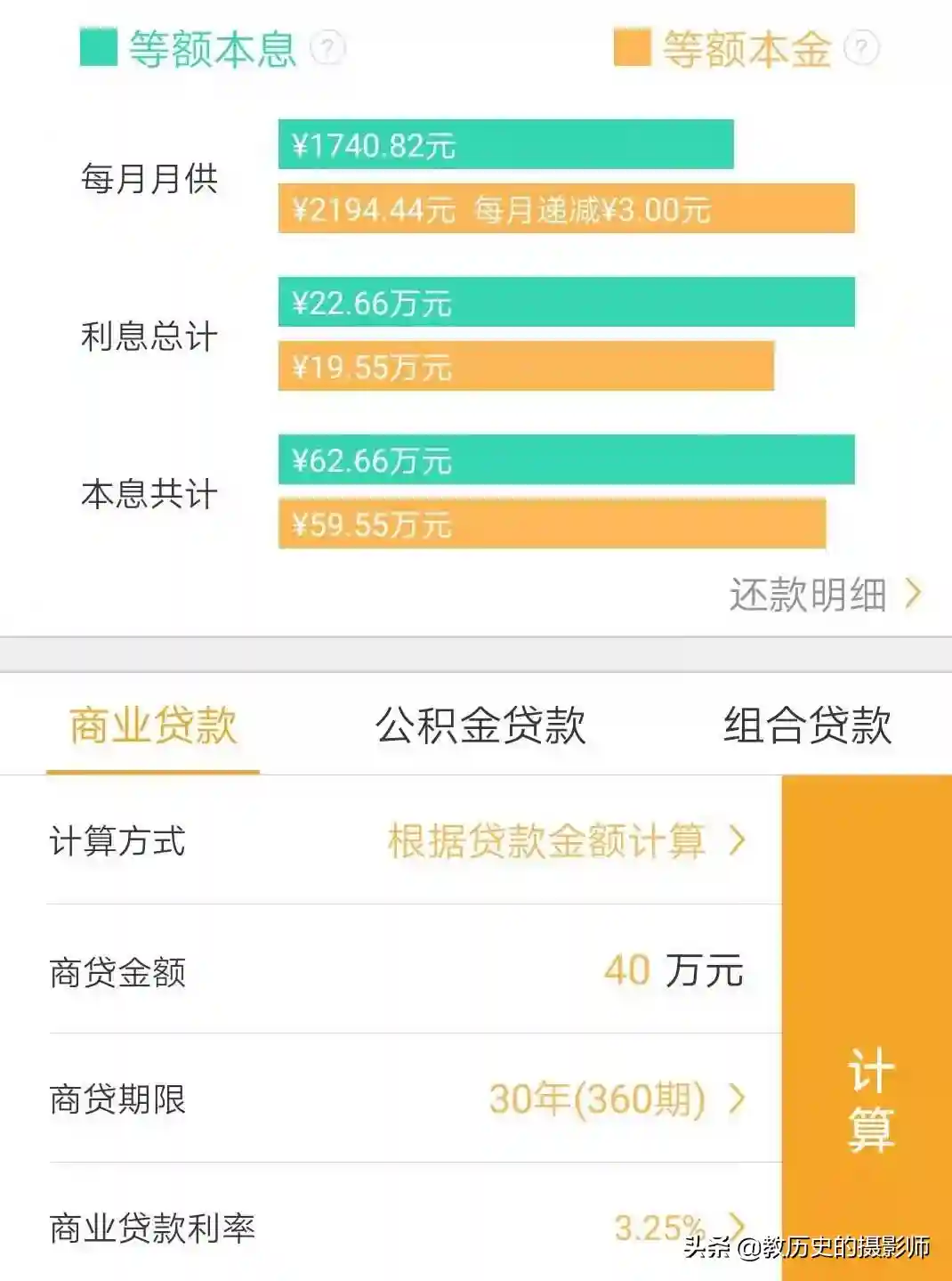 40万,贷30年,利率分别3.25%、4.90%、5.635%差别一目了然: